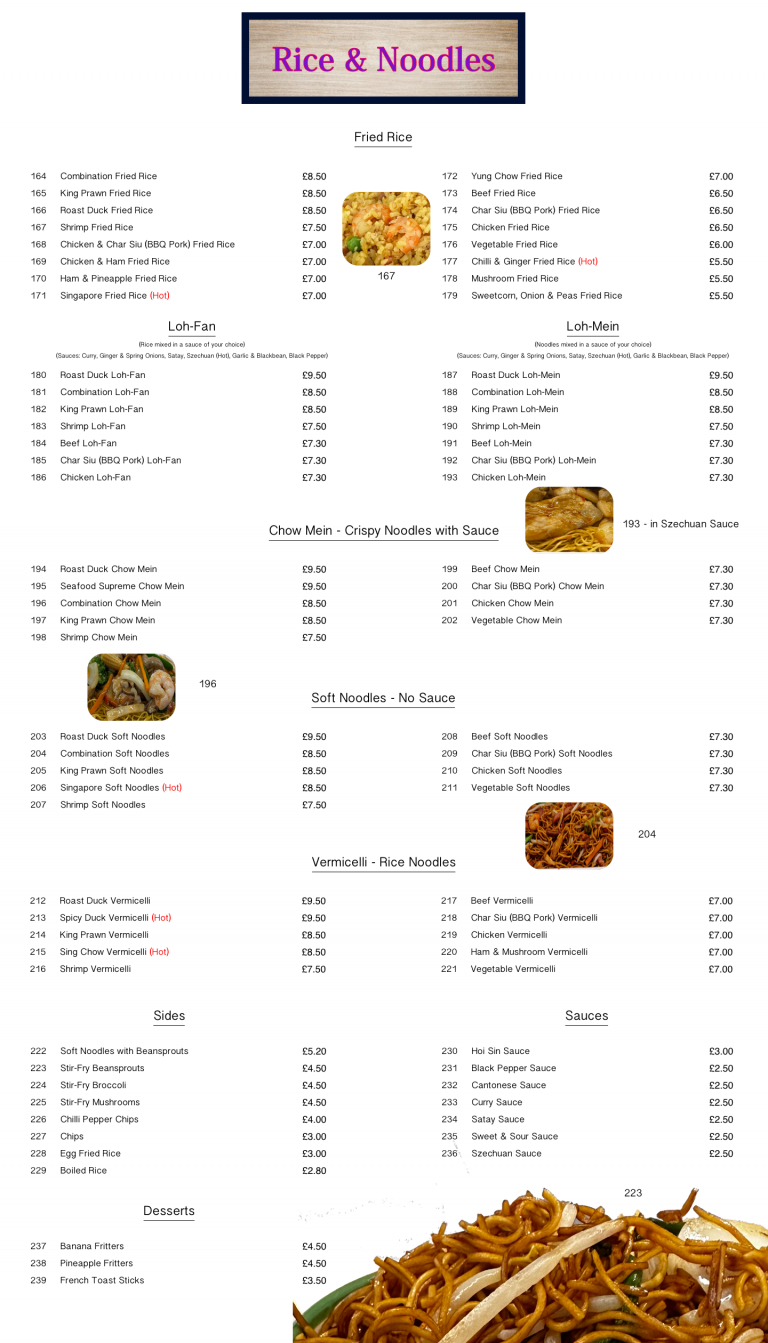| 171 | Singapore Fried Rice (Hot) | £7.00 |