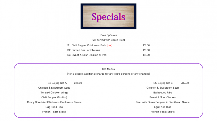 Beijing Set B (Chicken & Sweetcorn Soup, Barbecued Ribs, Sweet & Sour Chicken, Beef with Green Peppers in Blackbean Sauce, Egg Fried Rice, French Toast Sticks) |